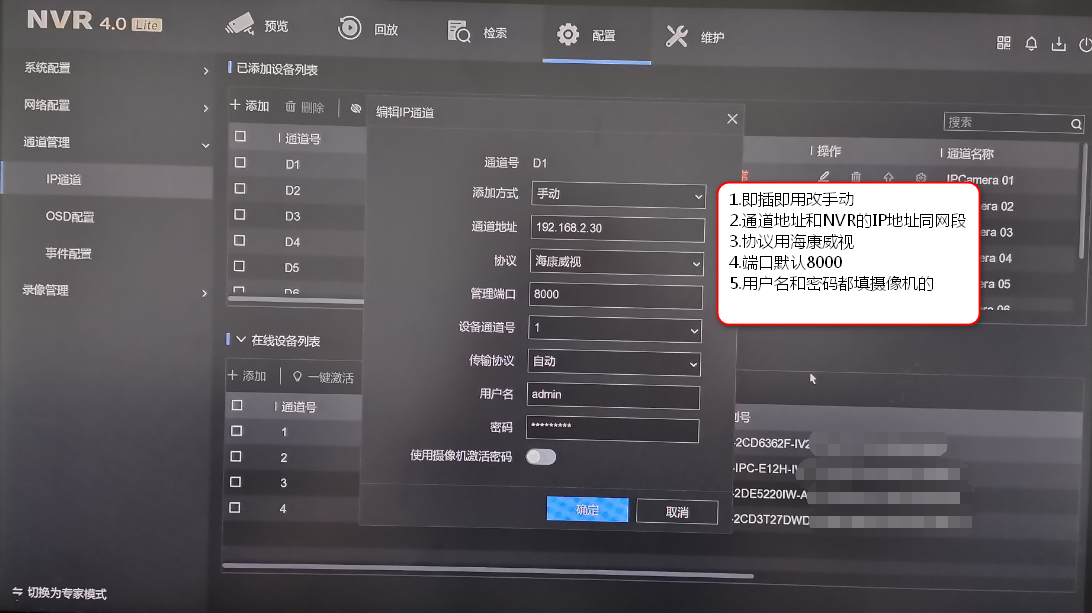 3、在IP通道编辑界面下,需将“添加方式”由“即插即用”更改为“手动”,并将“IP通道地址”由原来所填的即插即用通道默认IP,更改为搜索到的摄像机IP,输入摄像机协议(默认海康威视),管理端口(默认8000),用户名(默认admin),摄像机管理员密码(摄像机的激活密码或修改后的摄像机密码)