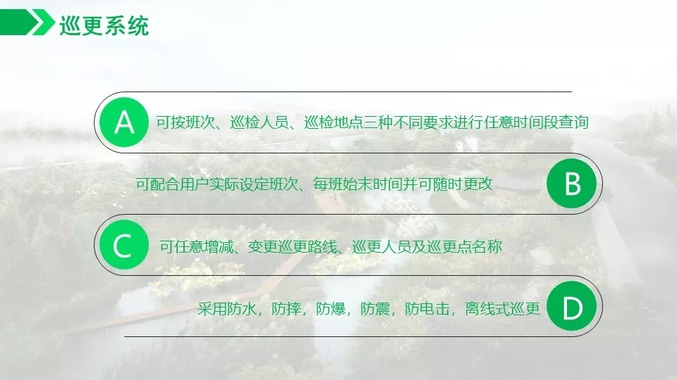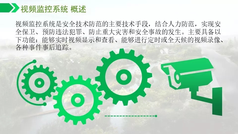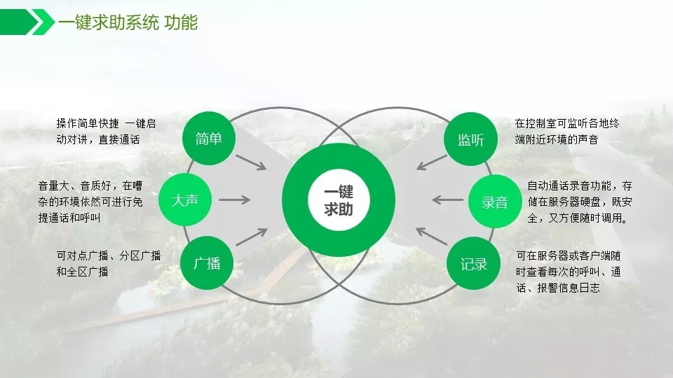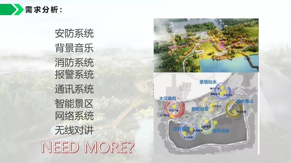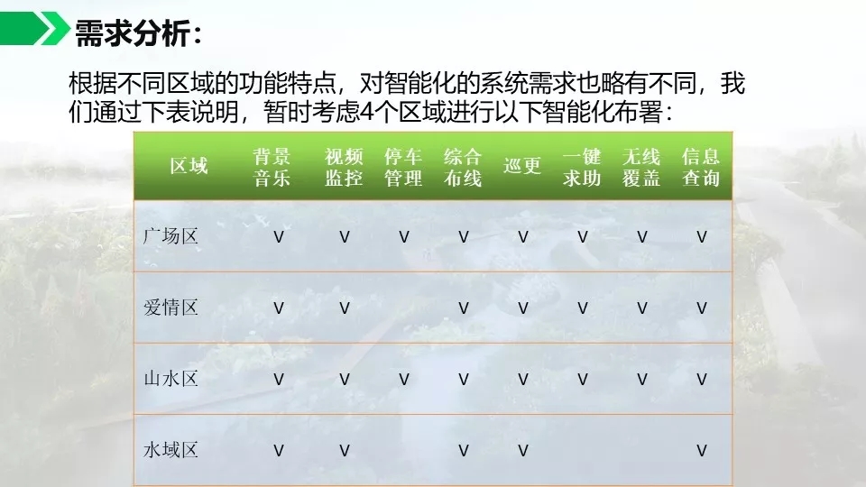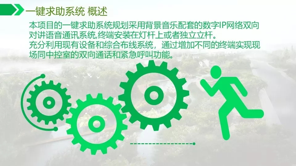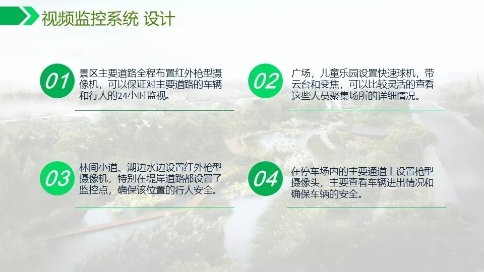 背景音乐可以实现自动分区,定时播放,实现无人值守。通过数字视频的智能分析功能可以对危险区域,如水面,陡坡等进行预警,如有非法进入,及时报警,预防事故发生。
