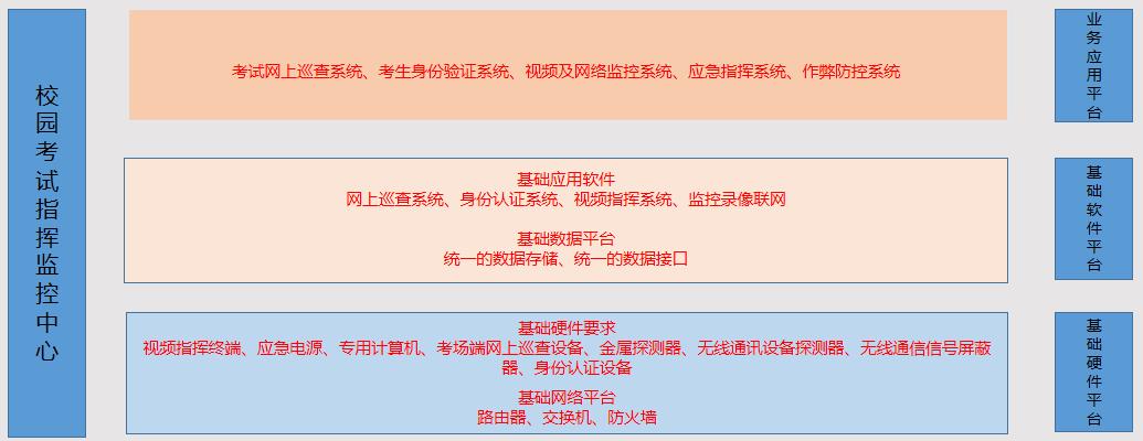 校园考场监控建设主要内容:网上巡查系统、视频指挥系统、考试业务管理系统、作弊防控系统、考生身份验证系统五大系统