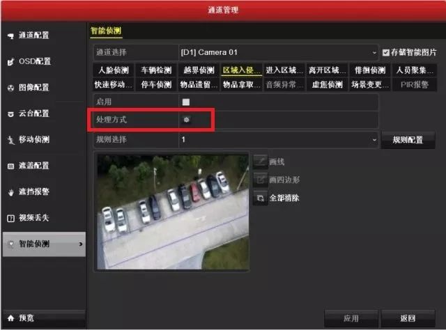 区域入侵侦测最多可设置4 条规则,具体条数要跟据摄像机型号来确定。